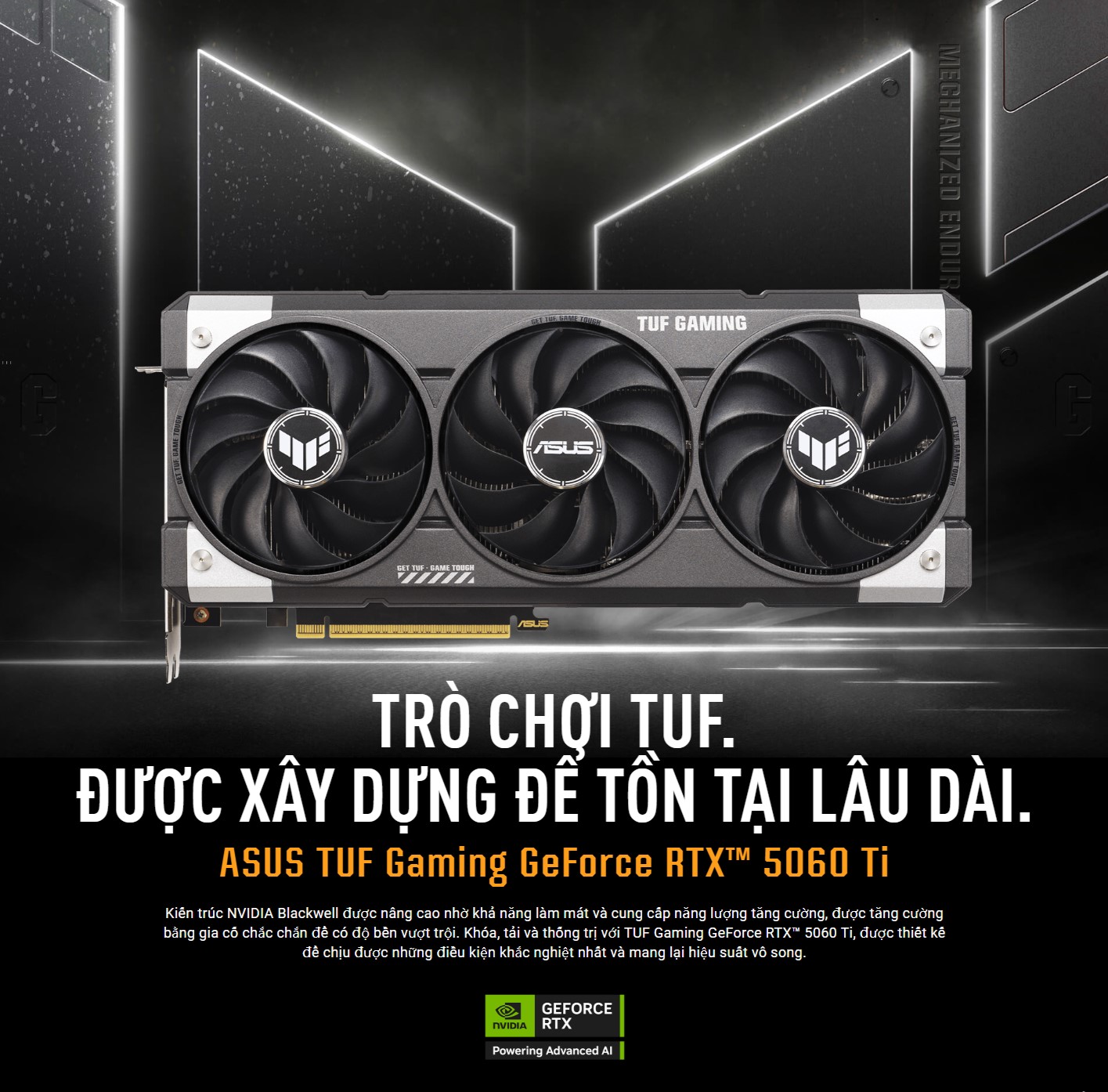 Card màn hình ASUS TUF RTX 5060 Ti 8GB GDDR7 OC Edition sử dụng GPU RTX 5060 Ti mới nhất, dựa trên kiến trúc Blackwell – một bước tiến lớn về hiệu suất đồ họa, AI, DLSS 4 và ray tracing.