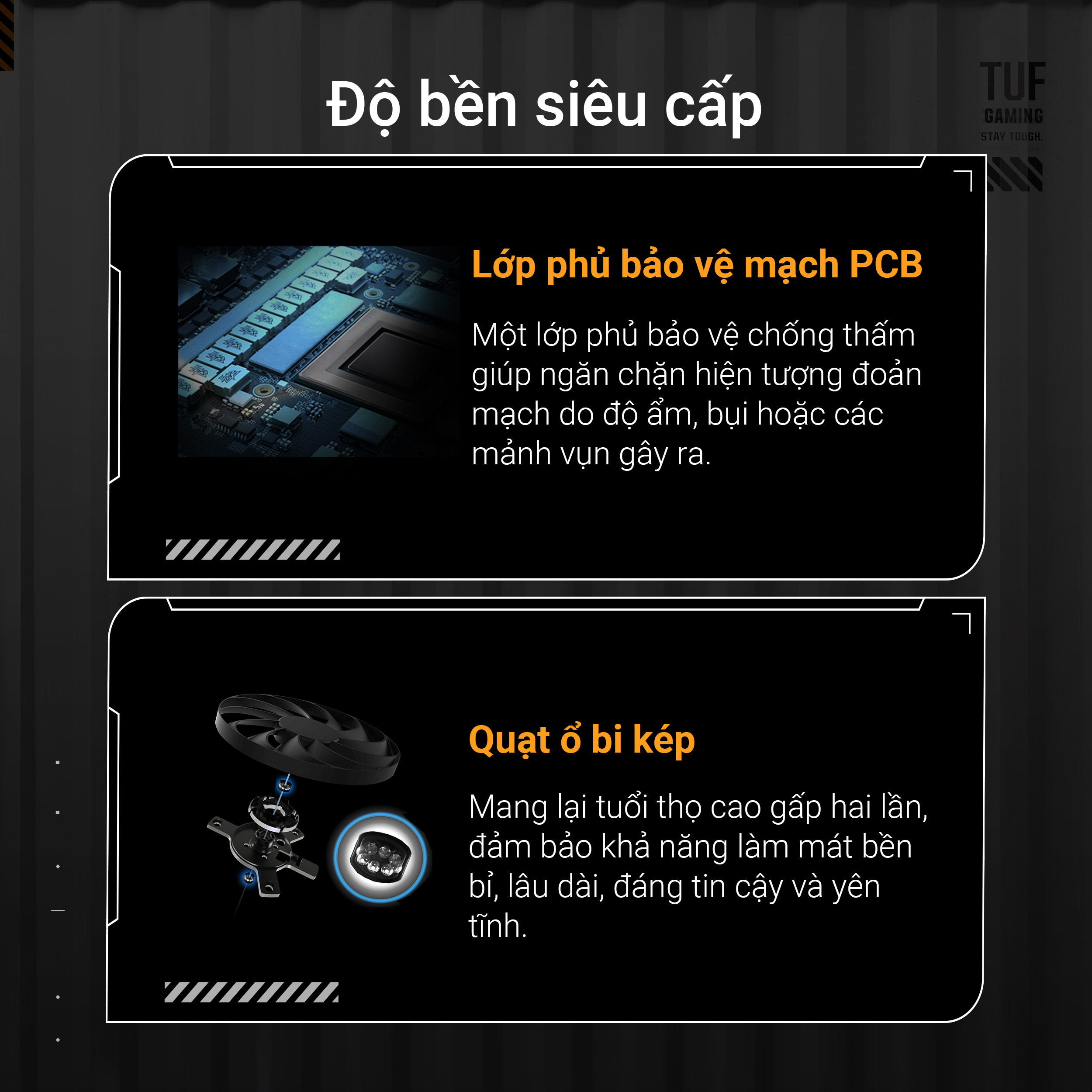 Với kích thước gọn gàng 302 x 133.5 x 62 mm, card đồ họa TUF Gaming 8GB dễ dàng lắp đặt trong nhiều loại case khác nhau. Công nghệ làm mát hiệu quả và thiết kế quân sự đặc trưng từ dòng TUF giúp card RTX 5060 Ti hoạt động bền bỉ, ngay cả trong môi trường tải nặng.