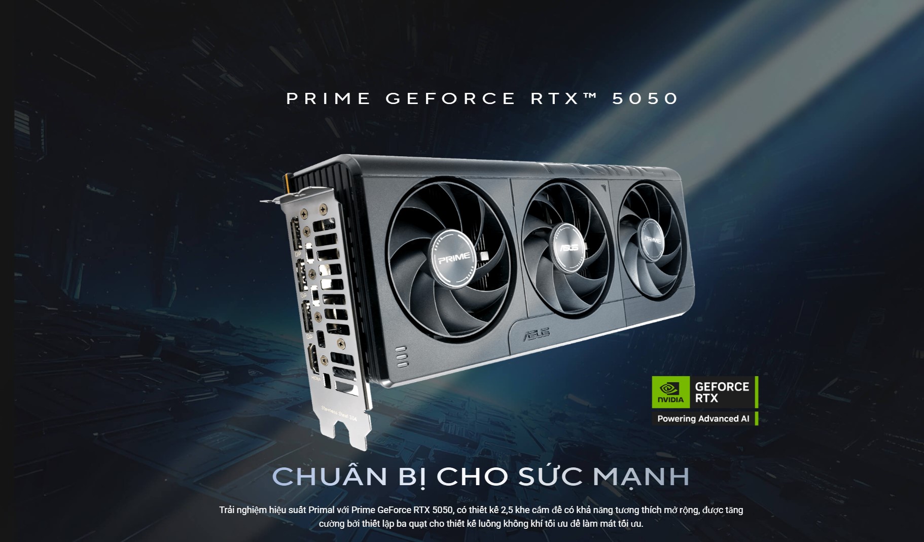 Thuộc dòng sản phẩm ASUS Prime hướng tới người dùng phổ thông và bán chuyên, chiếc card đồ họa RTX 5050 mang đến hiệu năng ổn định, thiết kế tối ưu và khả năng hỗ trợ các công nghệ tiên tiến như DLSS 4 và Ray Tracing, tất cả gói gọn trong một sản phẩm có mức giá dễ tiếp cận.
