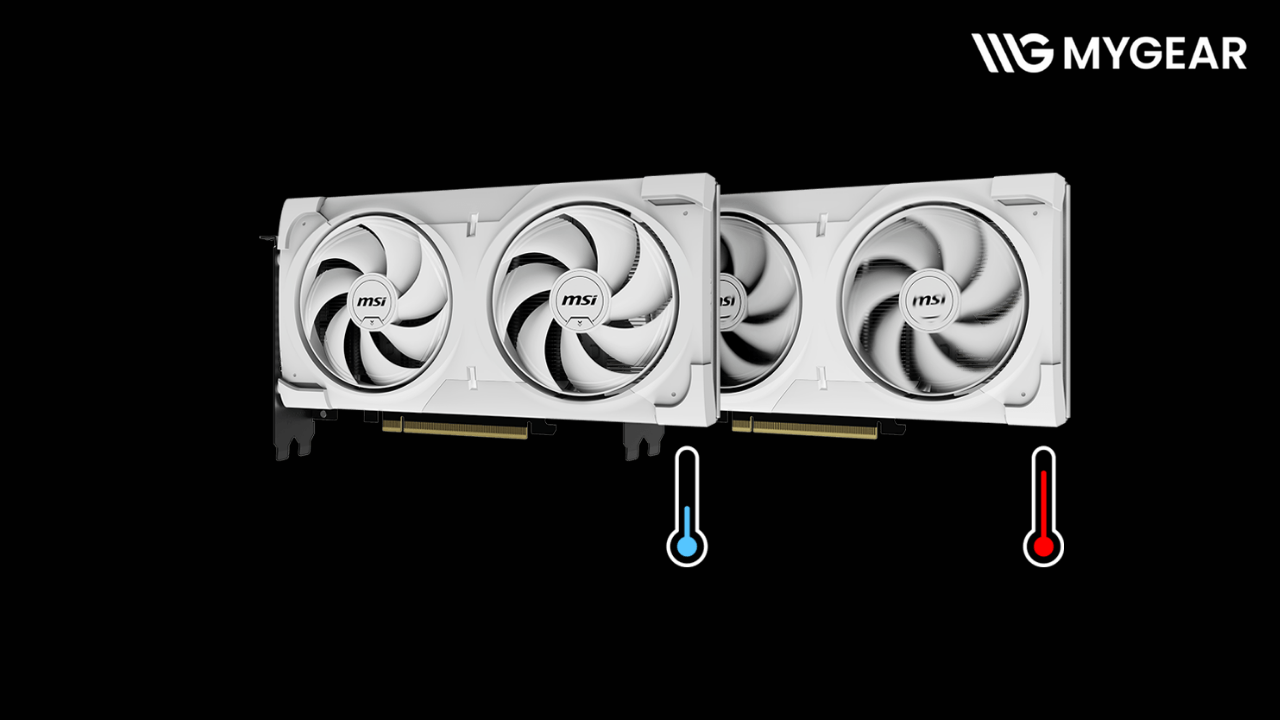 Card đồ họa MSI RTX 5060 Ti trắng được trang bị hệ thống STORMFORCE với hai quạt cánh đôi giúp tăng luồng gió tập trung vào khu vực tản nhiệt. Các ống dẫn nhiệt (Core Pipe) tiếp xúc trực tiếp GPU, giúp truyền nhiệt nhanh chóng, giữ cho card luôn mát mẻ ngay cả khi chơi game nặng hoặc render kéo dài. Nhờ Zero Frozr Technology, quạt sẽ tự dừng khi tải nhẹ, mang lại sự yên tĩnh gần như tuyệt đối.