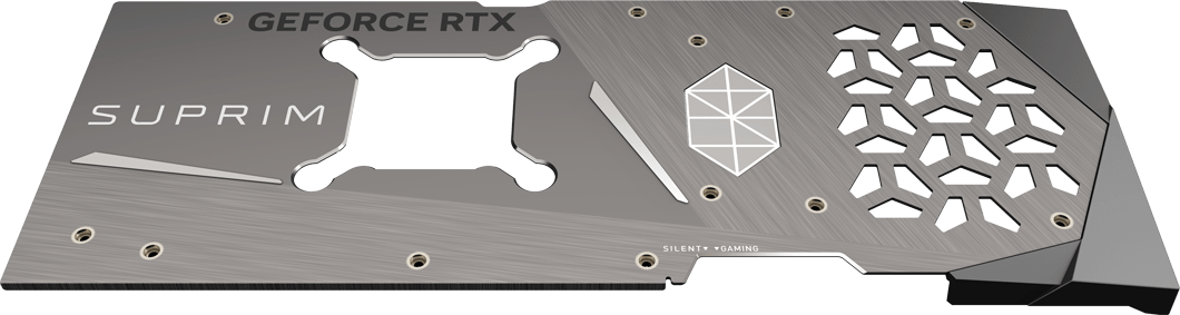 Được cấu tạo từ kim loại chắc chắn, tấm ốp lưng của MSI NVIDIA GeForce RTX 4070 Ti SUPRIM X có độ cứng cáp cần thiết để bảo vệ các vi mạch bên trong. Cùng với đó là những họa tiết, tô điểm rất nhiều cho VGA nói riêng và PC nói chung, tạo điểm nhấn cho dòng SUPRIM X. Trên đó cũng sẽ bao gồm các khe tản nhiệt, tạo điều kiện thoát khí nóng ra ngoài một cách dễ dàng. dễ dàng thoát ra ngoài và tránh tích tụ nhiệt bên trong.