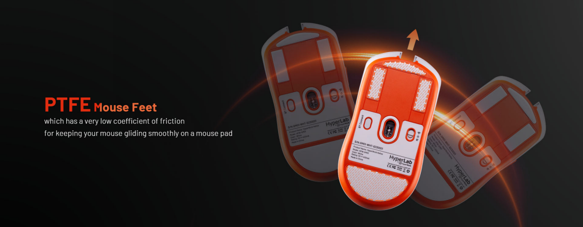 Chuột Gaming HyperWork Helios có feet chuột chất iệu PTFE giúp cho hệ số ma sat rất thấp giúp di chuyển mượt hơn, nhẹ nhàng hơn.
