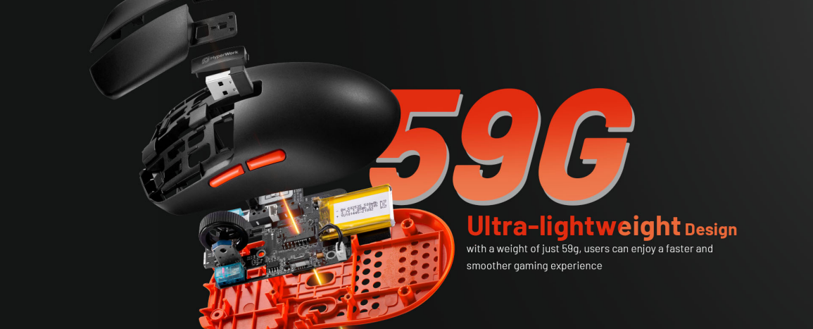 Chuột Gaming HyperWork Helios sở hữu trọng lượng chỉ 59g, người dùng có thể tận hưởng tốc độ nhanh hơn, trải nghiệm game một cách mượt mà hơn.
