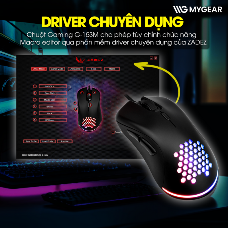 Hỗ trợ tính năng macro, Zadez G-153M cho phép người chơi gán các tổ hợp phím phức tạp vào nút bấm nhanh, giúp rút ngắn thời gian thao tác và tạo lợi thế trong các game chiến thuật hoặc MMO.