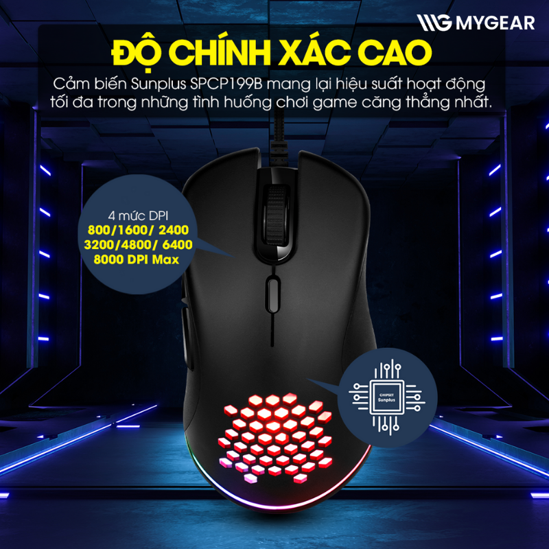 Được trang bị cảm biến Sunplus SPCP199B hiện đại, chuột gaming 8000 DPI cho phép người chơi dễ dàng tùy chỉnh độ nhạy phù hợp với từng thể loại game. Với FPS, bạn có thể hạ DPI để ngắm bắn chính xác hơn, trong khi với MOBA, tốc độ cao lại mang đến sự linh hoạt trong di chuyển.
