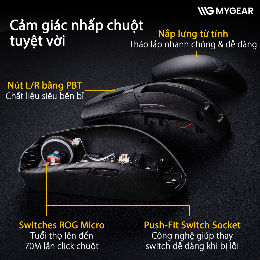 Chuột không dây gaming ROG sử dụng ROG 70M Mechanical Switch, có tuổi thọ cao, phản hồi nhạy và ổn định, tối ưu trải nghiệm chơi game, đặc biệt khi phải nhấn liên tục hoặc thi đấu cường độ cao.
