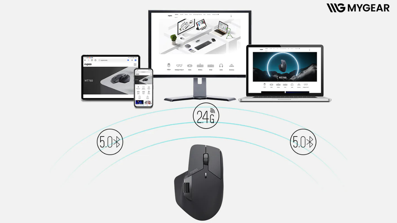 Một trong những điểm mạnh nhất của chuột không dây Rapoo MT760 Mini Multimode chính là khả năng hỗ trợ nhiều chế độ kết nối với Bluetooth 5.0, Wireless 2.4GHz và USB-C có dây. Nhờ công nghệ chuột đa chế độ kết nối, bạn có thể kết nối cùng lúc nhiều thiết bị (laptop, PC, tablet, smartphone) và chuyển đổi chỉ với một nút bấm. Đây là giải pháp tối ưu cho những người dùng thường xuyên làm việc đa nền tảng.
