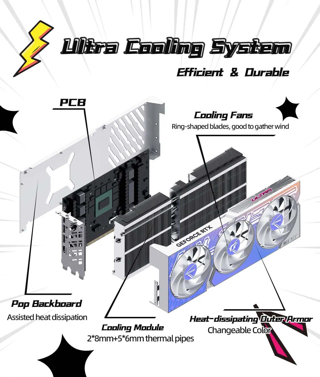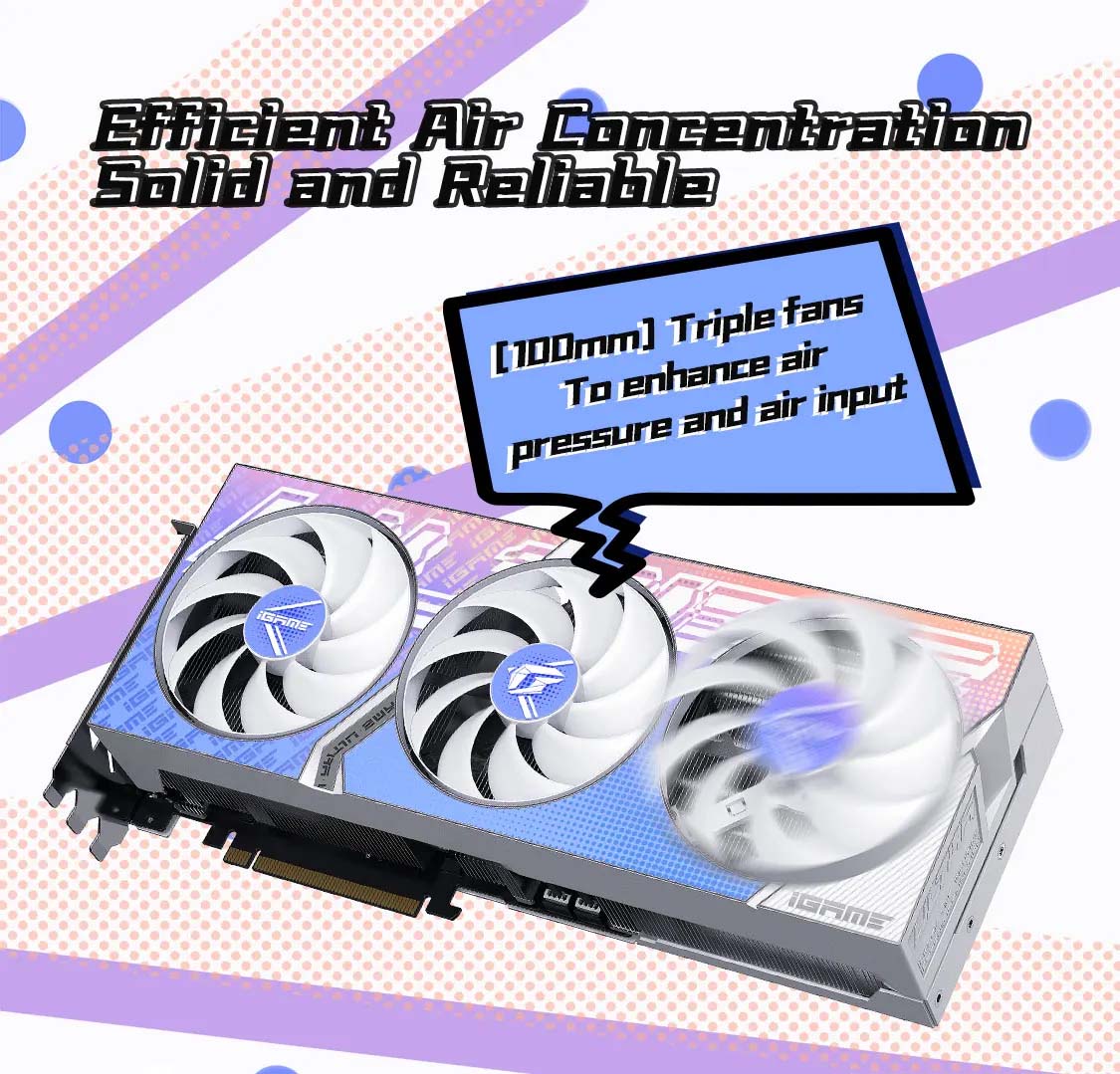 RTX 4080 SUPER Ultra W OC được Colorful trang bị hệ thống làm mát tiên tiến với các quạt làm mát lớn và công nghệ làm mát bằng chất lỏng, đảm bảo nhiệt độ của card luôn ở mức ổn định kể cả khi hoạt động ở tải cao. Hệ thống làm mát không chỉ giúp tối ưu hiệu suất mà còn kéo dài tuổi thọ của sản phẩm.