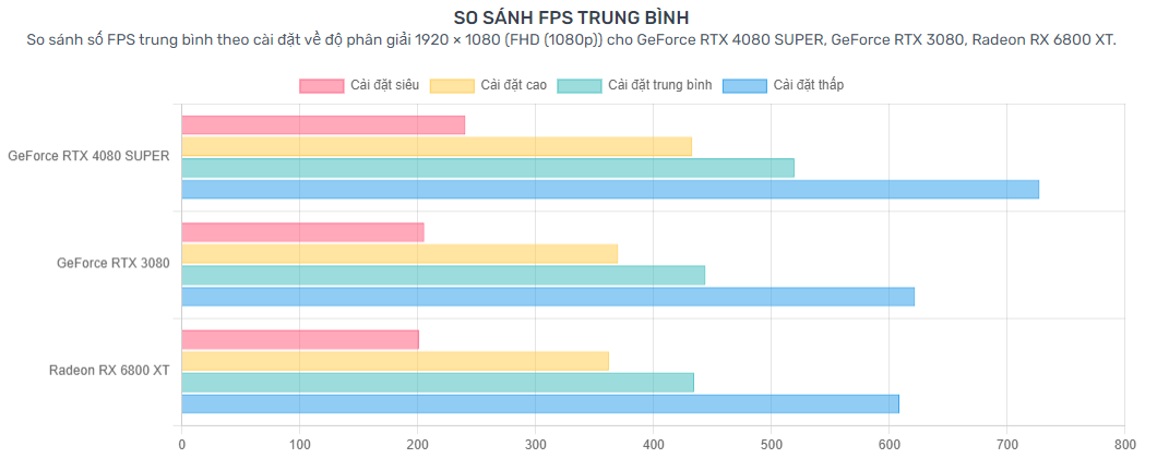 Kết quả benchmark: Trong các bài kiểm tra benchmark, RTX 4080 SUPER Ultra W OC có khả năng đạt FPS (Frames Per Second) cao đáng kể trên các tựa game AAA ở chế độ độ phân giải 4K. So sánh với những dòng card màn hình khác như RTX 3080 hay Radeon RX 6800 XT, RTX 4080 SUPER Ultra W OC luôn nổi trội về cả số FPS và độ ổn định.
