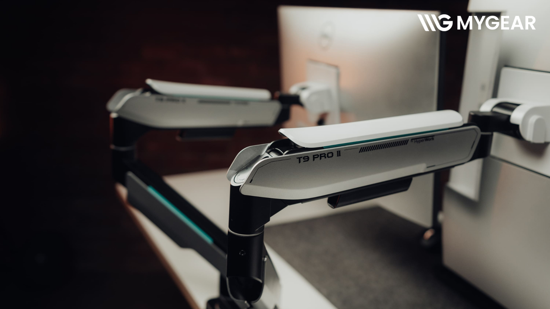 T9 Pro II Dual Grey sở hữu hai tay đỡ độc lập, cho phép điều chỉnh từng màn hình theo nhu cầu riêng biệt. Người dùng có thể thiết lập một màn hình ngang và một màn hình dọc hoặc đặt song song để tối ưu hiệu suất làm việc.