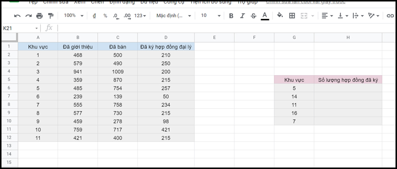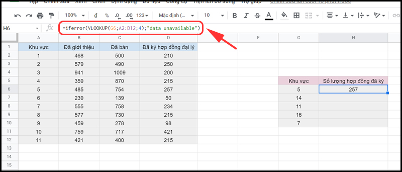 Bạn hãy tìm kiếm số lượng hợp đồng đã ký theo các khu vực tại các ô G6, G7, G8, G9, G10 bằng hàm VLOOKUP và hãy xử lý lỗi bằng hàm IFERROR.