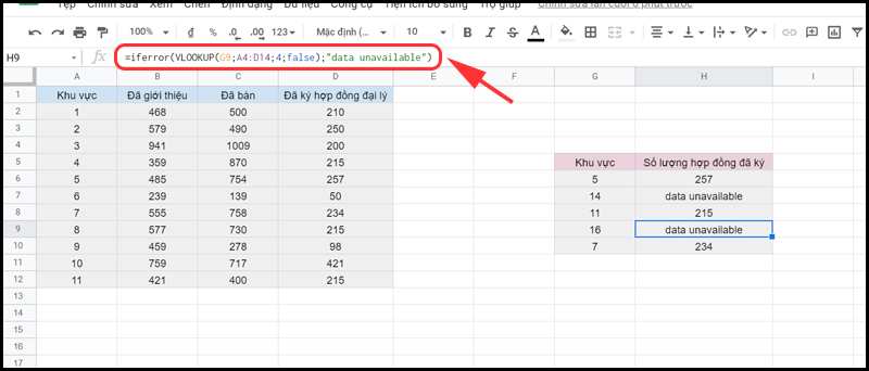 Nếu có lỗi, hàm IFERROR sẽ trả lại kết quả data unavailable như ta đã chỉ định từ trước như hình trên