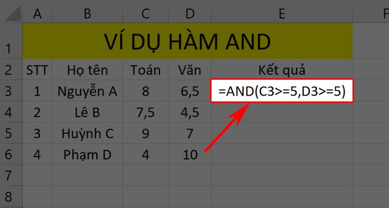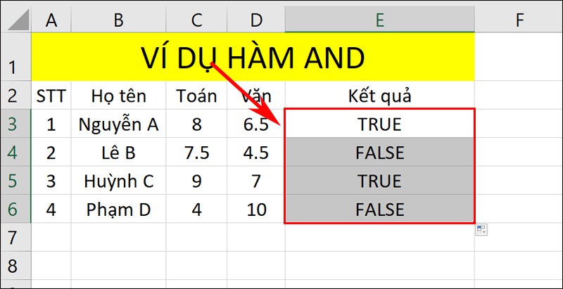 Giải thích: Trong ví dụ này, các kết quả trả về là FALSE, điều này cho biết Lê B và Phạm D không đạt tiêu chuẩn học sinh giỏi vì một trong hai môn Toán hoặc Văn có điểm dưới 5.