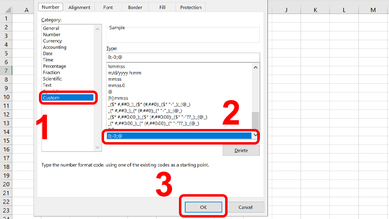 Nhấn vào Custom cuộn xuống chọn giá trị 0;-0;;@ và nhấn OK như hình trên