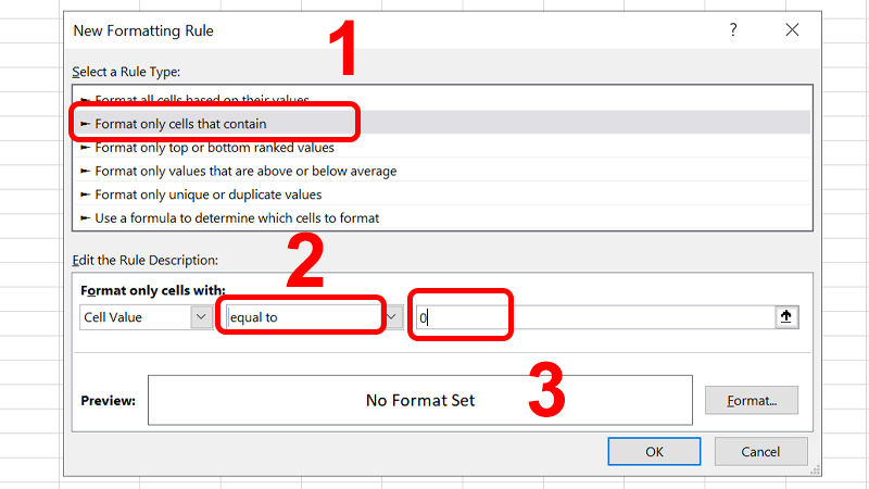 Chọn Format only cells that contain và chọn Equal to điền số 0 vào ô bên cạnh như hình trên