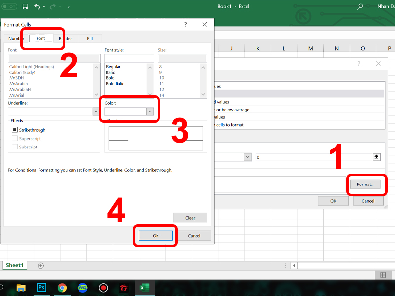 Bước 4: Để định dạng lại ô, bạn chọn Format > Sau khi chuyển sang tab Font > Nhấn chọn màu trắng ở phần Color > Cuối cùng, bạn nhấn vào phím OK.