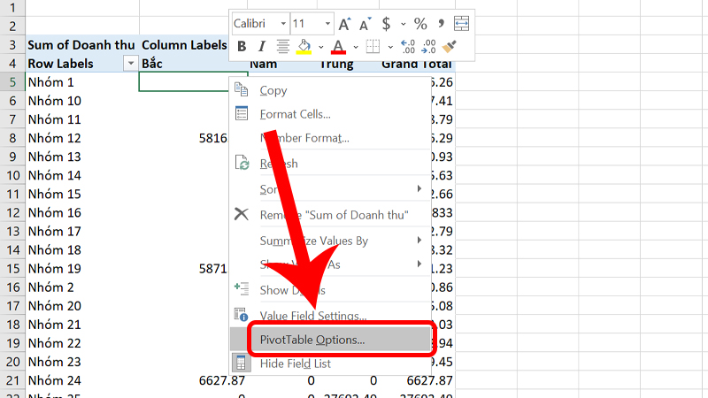 Bước 1: Bạn nhấn chuột phải vào ô có giá trị 0 > Sau đó nhấn chọn PivotTable Options.