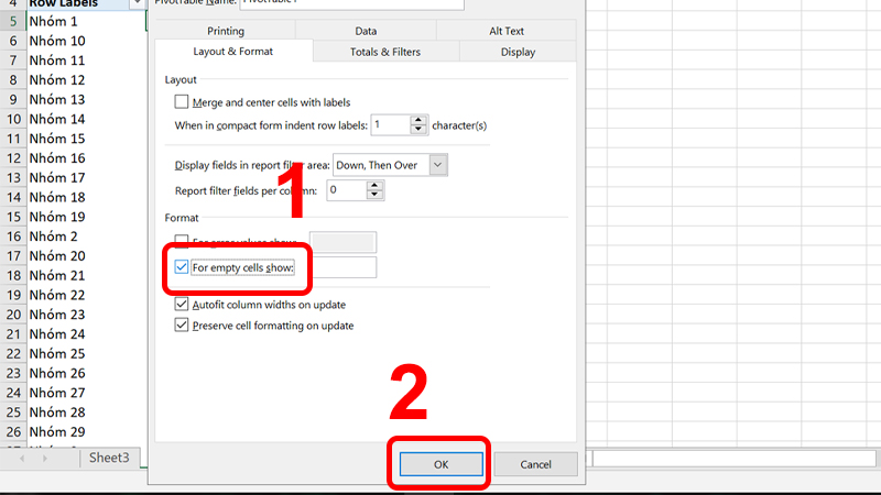 Bước 2: Tiếp theo, bạn tích chọn vào ô For empty cells show > Cuối cùng, bạn nhấn OK để lưu.