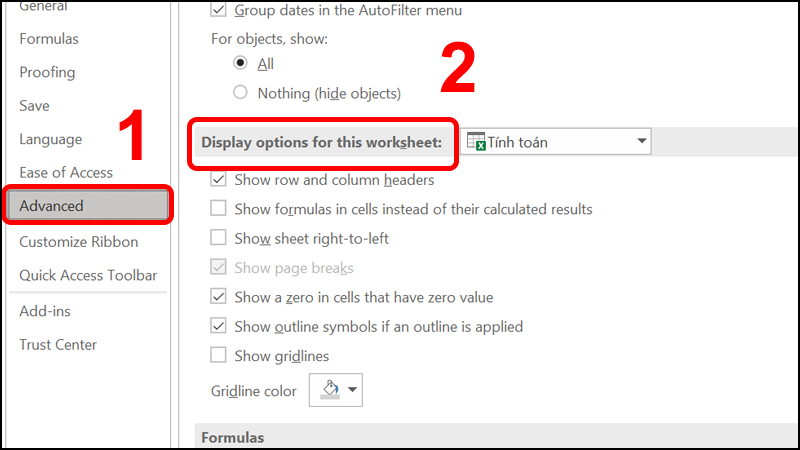 Bước 3: Tại tab Advanced > Bạn tiến hành cuộn xuống phần Display options for this worksheet.