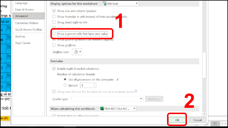 Bước 4: Sau đó, bạn tiến hành bỏ chọn mục Show a zero in cells that have zalo value > Cuối cùng, bạn nhấn OK.