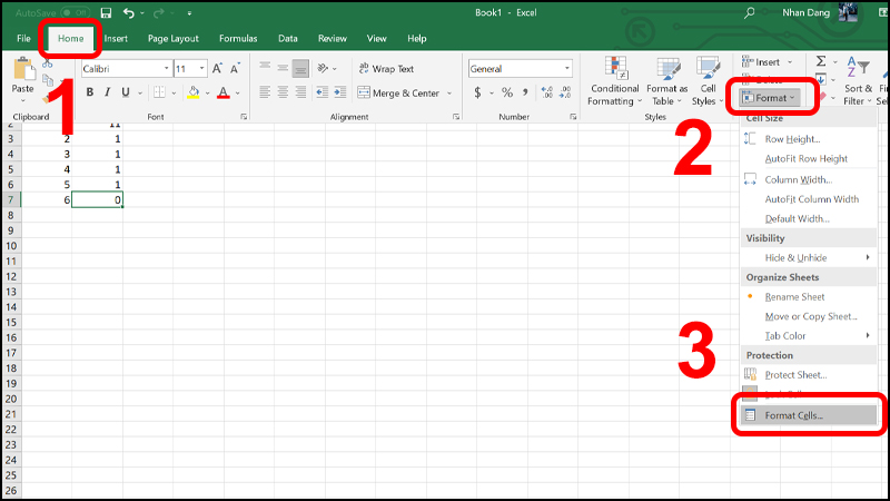 Trong tab Home nhấn vào Format và chọn Format Cells như hình trên