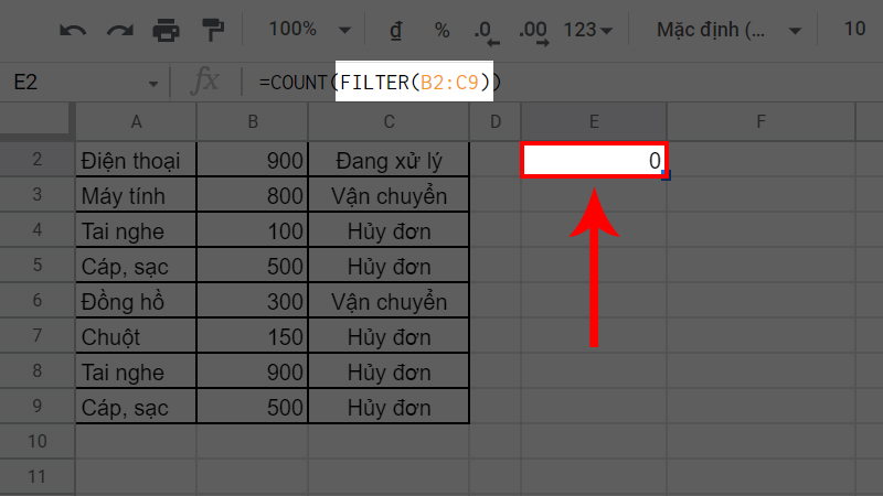 =COUNT(FILTER(B2:C9;C2:C9="Hủy đơn"))