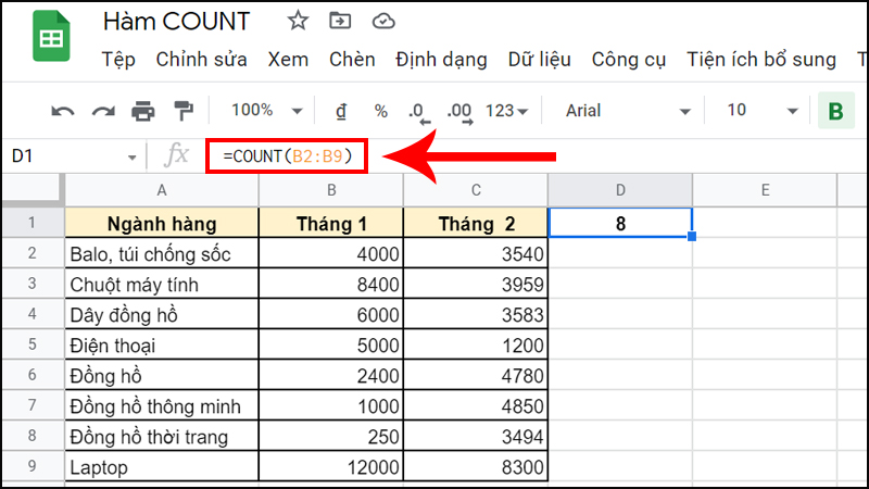 Ví dụ minh họa: Bạn có thể sử dụng hàm COUNT để đếm số lượng ngành hàng đã bán ra trong tháng 1.