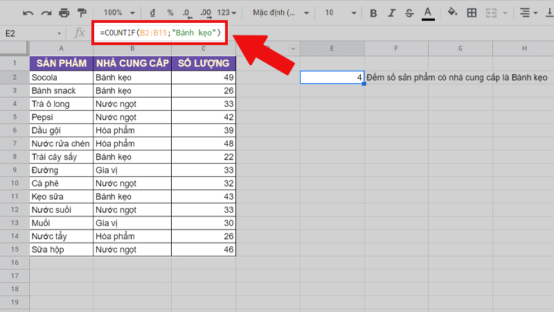 Công thức là: =COUNTIF(B2:B15;"Bánh kẹo")