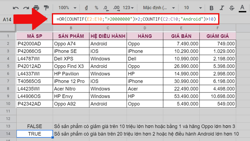 Công thức là: =OR(COUNTIF(E2:E10;">20000000")>2;COUNTIF(C2:C10;"Android")>10)