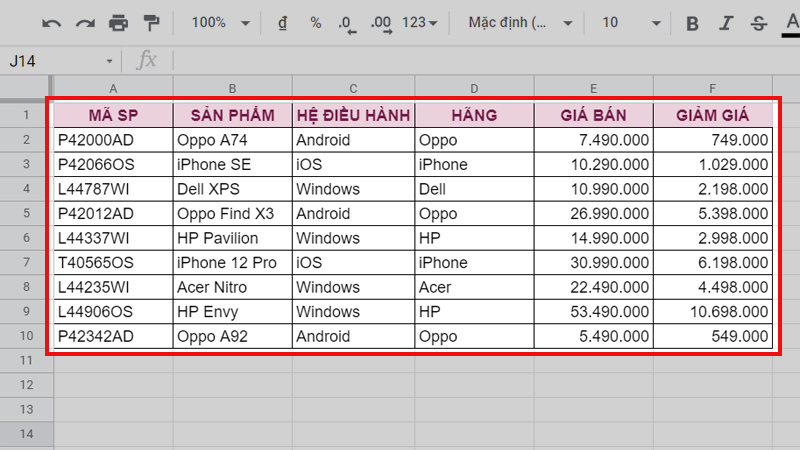 Cho bảng dữ liệu về thông tin sản phẩm gồm các trường sau: MÃ SP, SẢN PHẨM, HỆ ĐIỀU HÀNH, HÃNG, GIÁ BÁN, GIẢM GIÁ.