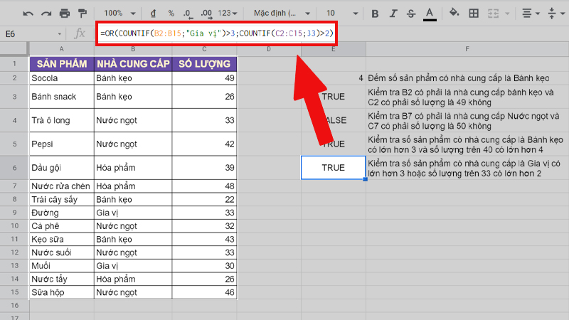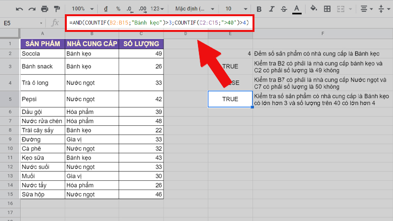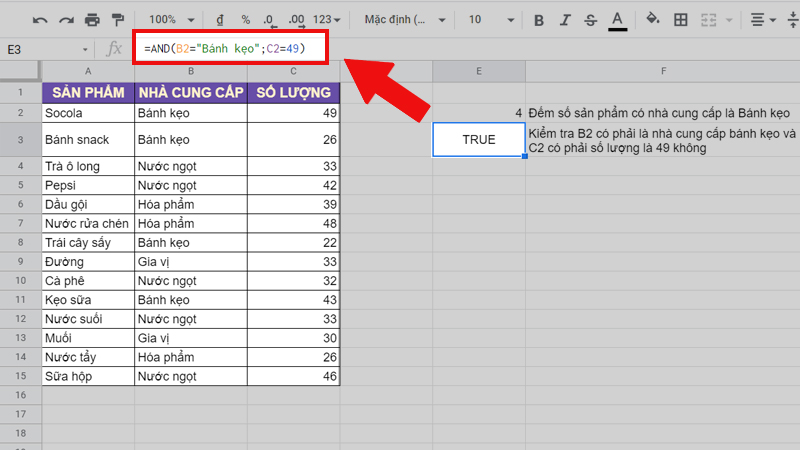 Hãy kiểm tra xem B2 có phải là nhà cung cấp bánh kẹo và C2 có phải có số lượng là 49 không. Kết quả hai biểu thức đều đúng nên sẽ trả về là TRUE.