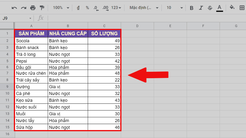 Cho bảng dữ liệu gồm các trường sau: SẢN PHẨM, NHÀ CUNG CẤP, SỐ LƯỢNG SP. Bảng dữ liệu này sẽ được sử dụng xuyên suốt cho các ví dụ dưới đây nhé.
