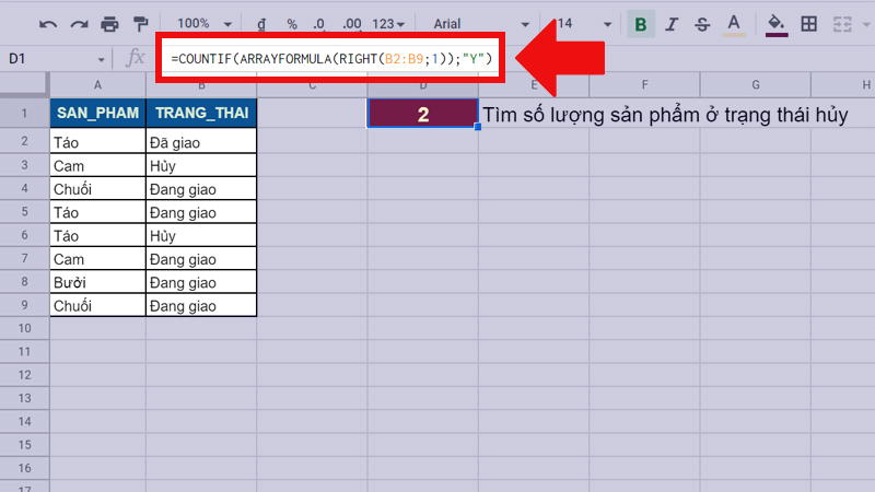 - Ý nghĩa của công thức: Tiến hành đếm số lần xuất hiện trạng thái “Hủy” trong dải ô B2:B9 bằng cách đếm số ký tự “Y” bên phải của chữ. Kết quả trả về sẽ là 2.