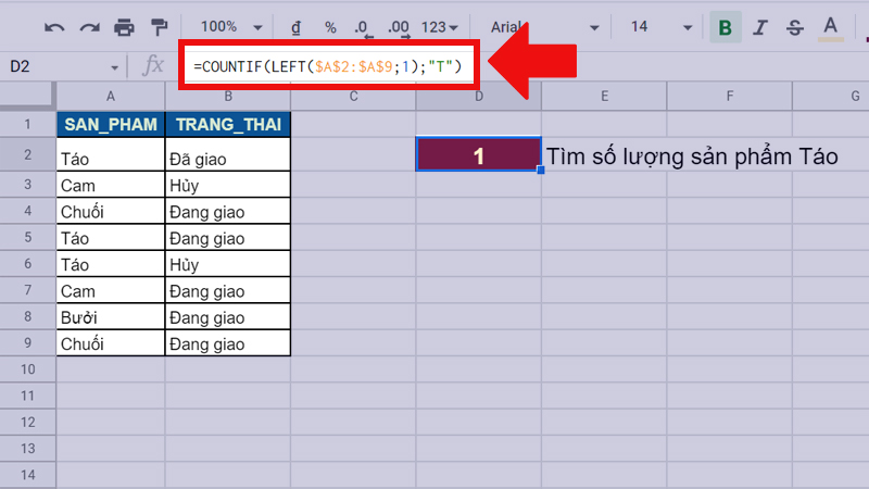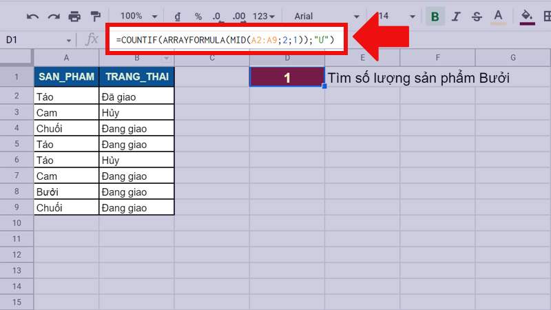 - Ý nghĩa của công thức: Tiến hành đếm số lần xuất hiện sản phẩm “Bưởi” trong dải ô A2:A9 bằng cách đếm số ký tự “Ư” ở giữa của chữ. Kết quả trả về sẽ là 1.