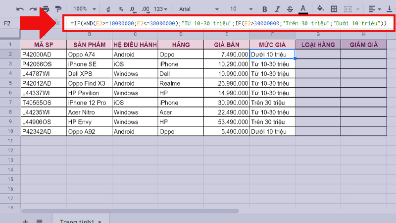 - Giải thích: Nếu giá bán sản phẩm lớn hơn hoặc bằng 10000000 và nhỏ hơn hoặc bằng 30000000 thì kết quả sẽ trả về chuỗi “Từ 10-30 triệu”. Nếu giá bán sản phẩm lớn hơn 30000000 thì kết quả sẽ trả về chuỗi “Trên 30 triệu”. Còn lại là “Dưới 10 triệu”.