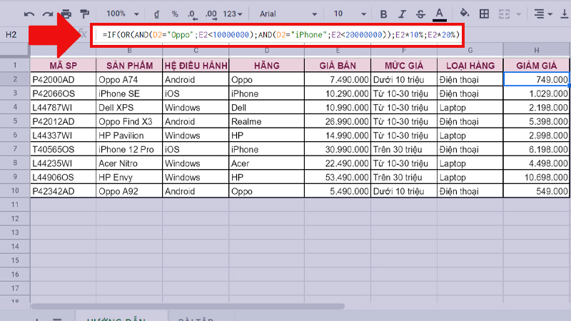 - Giải thích: Nếu hãng điện thoại Oppo có giá bán dưới 10000000 hoặc iPhone có giá bán dưới 20000000 thì giảm 10% giá bán. Các sản phẩm còn lại sẽ được giảm 20% giá bán.