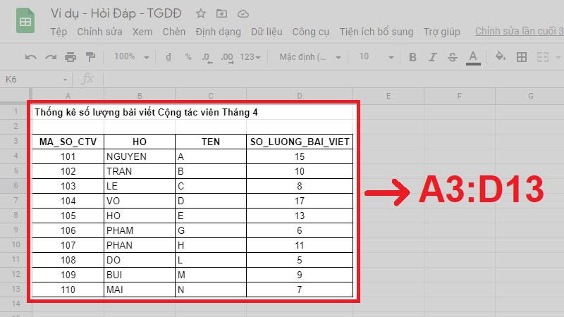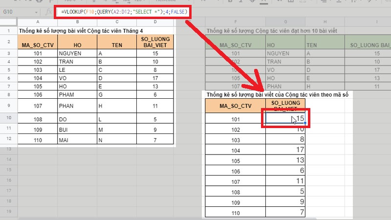 Các bạn hãy áp dụng hàm QUERY để lọc dữ liệu từ bảng tính Thống kê số lượng bài viết Cộng tác viên Tháng 4 dưới đây: