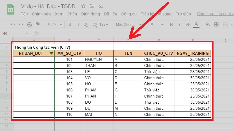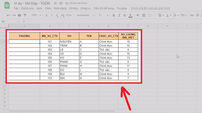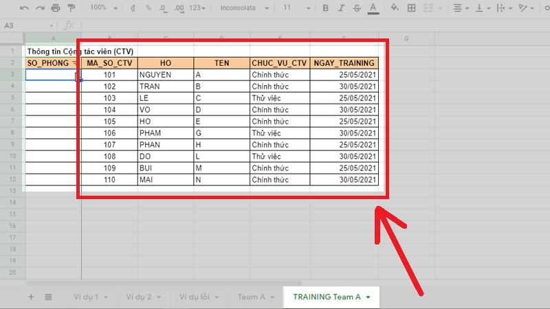 Bảng sẽ gồm một trang tính (được gọi là “Nhóm A”) bao gồm danh sách những cộng tác viên (CTV) làm việc cho nhóm của A. Bảng dữ liệu gồm các trường như sau: Mã CTV, Họ, Tên và Số lượng bài viết của mỗi CTV trong tháng.