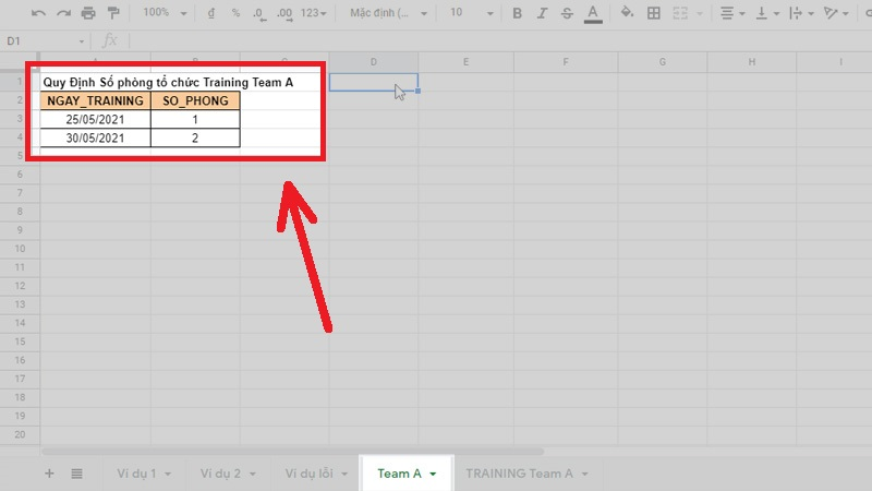 Bảng dữ liệu sẽ quy định phòng Traning cho Team A