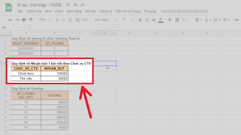 Ta có bảng dữ liệu những thông tin quy định, trong đó sẽ có quy định về tiền nhuận bút của các CTV theo chức vụ tại của Team A.