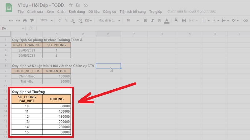 Ta có bảng dữ liệu các thông tin quy định, trong đó sẽ có quy định về tiền thưởng theo số lượng bài viết của CTV Team A.
