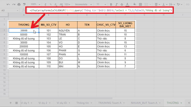 Bảng dữ liệu tính thưởng cho team A như hình trên