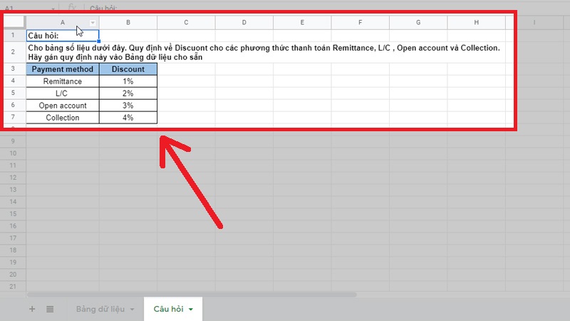 Đề bài yêu cầucác bạn gắn quy định về Discount (chiết khấu) cho từng phương thức thanh toán tương ứng vào bảng dữ liệu cho sẵn như hình.