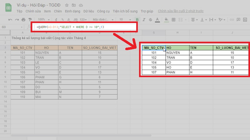 + "SELECT * WHERE E >= 10": là lấy ra dữ liệu của tất cả các cột với điều kiện Số lượng bài viết >= 10.