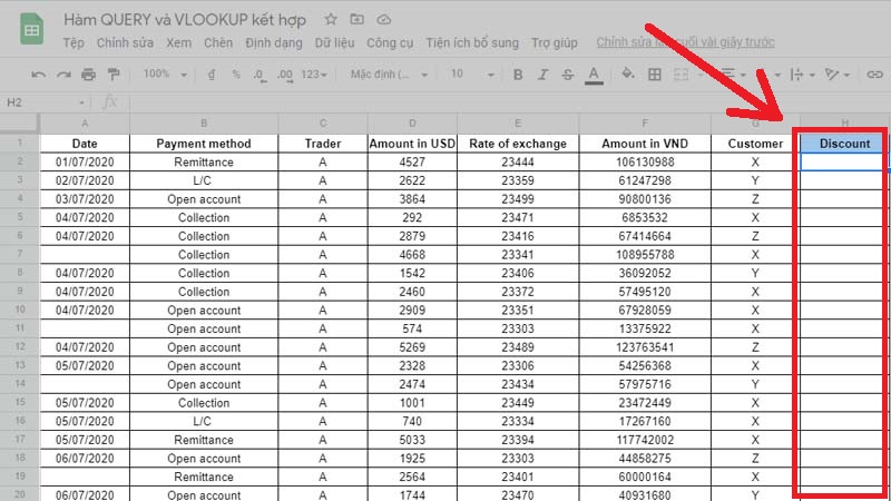 + query('Câu hỏi'!A3:B7;"select * ");2;false: là tìm kiếm dữ liệu từ file Câu hỏi, lọc và so sánh các giá trị trong vùng A3:B7 để lấy dữ liệu Discount được yêu cầu phải gắn vào.