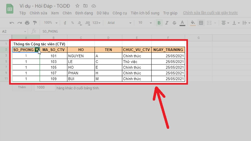Kết hợp sử dụng bộ lọc trong Google Sheet để có thể dễ dàng biết được tất cả số lượng thành viên tham gia training theo ngày và theo phòng như thế nào nhé.