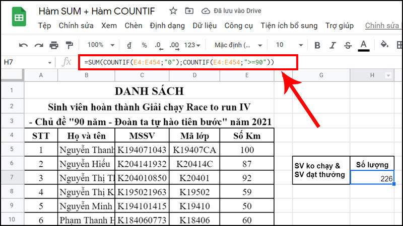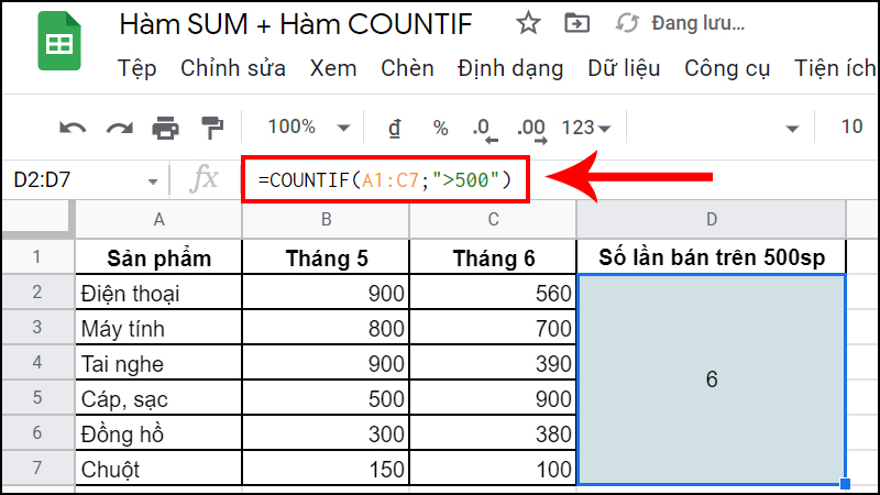 Kết hợp hàm SUM và hàm COUNTIF trong Google Sheet như hình trên