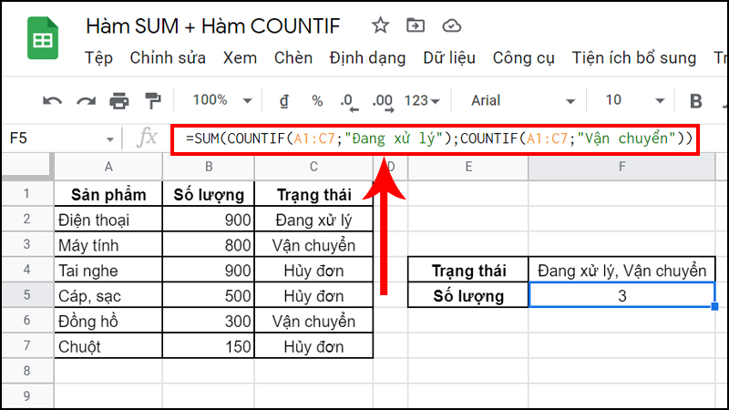 Ví dụ minh họa: Kết hợp hàm SUM và hàm COUNTIF để tính tổng số đơn hàng ở trạng thái Đang xử lý và Vận chuyển.