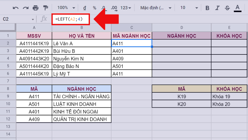 Bước 1: Bạn cần sử dụng hàm LEFT để lấy ra mã ngành học trong MSSV.