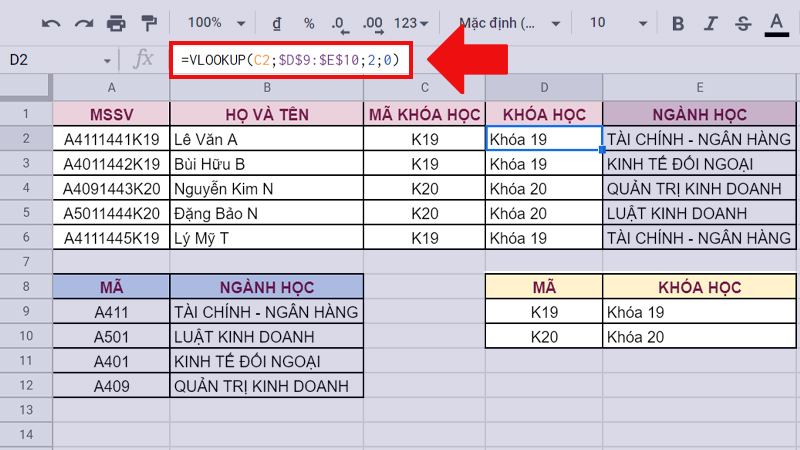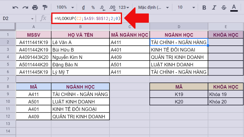 Tại ô D2 > Bạn tiến hành nhập công thức “=VLOOKUP(C2;$A$9:$B$12;2;0)” > Sau đó bạn nhấn enter > Cuối cùng, hàm sẽ cho ra kết quả ngành học theo đối chiếu ở bảng ngành học.